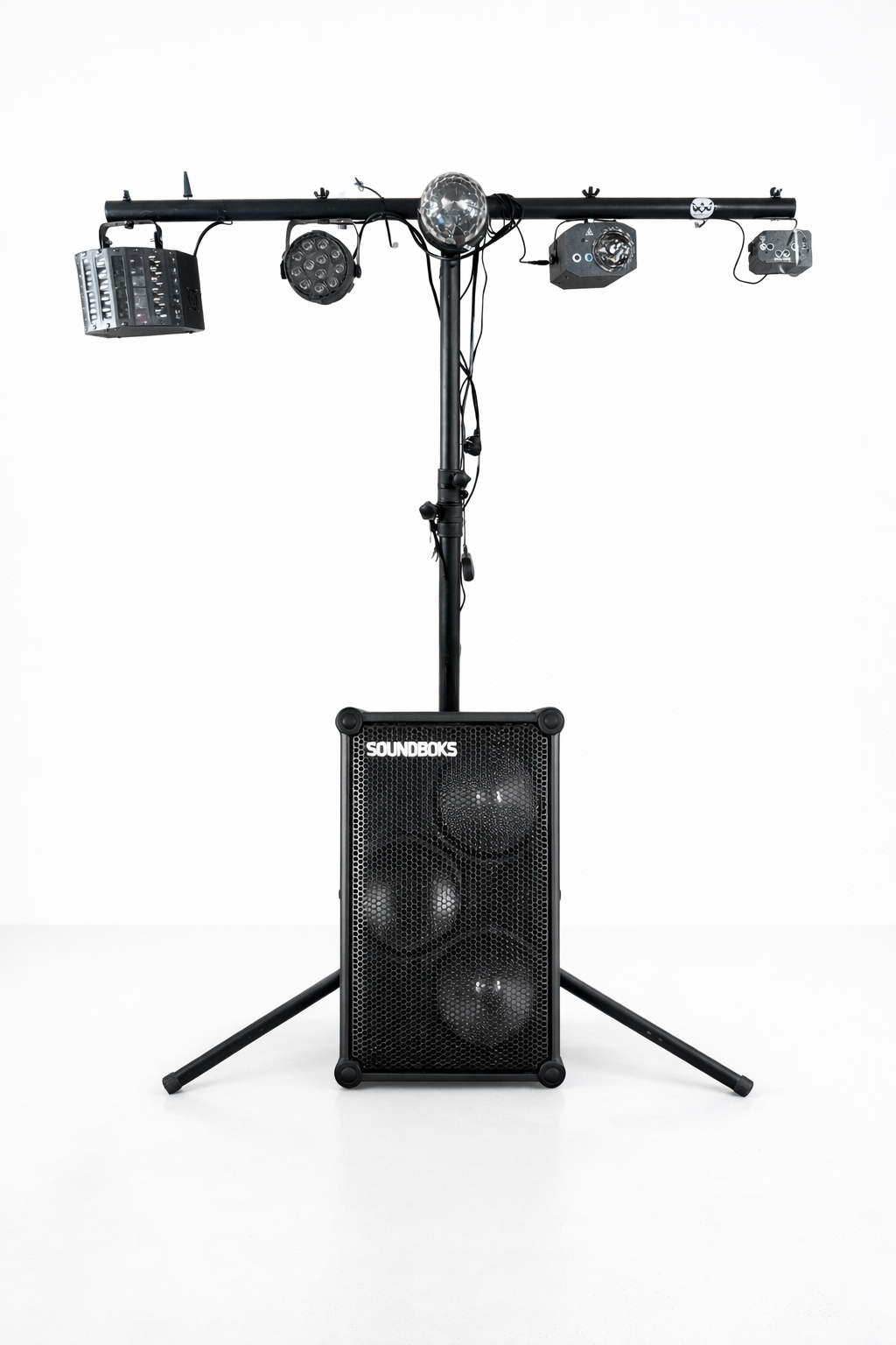 Lys- og røykpakke – Komplett stemning til fest og event LASER / DERBY / RØYK 1 stk. Røykmaskin 400 watt På stativ: 2 stk. diskolys montert på stativ 2 stk. LASER 1. stk. RGB led pan + 1 stk. Soundboks 3! Pris pr. helg