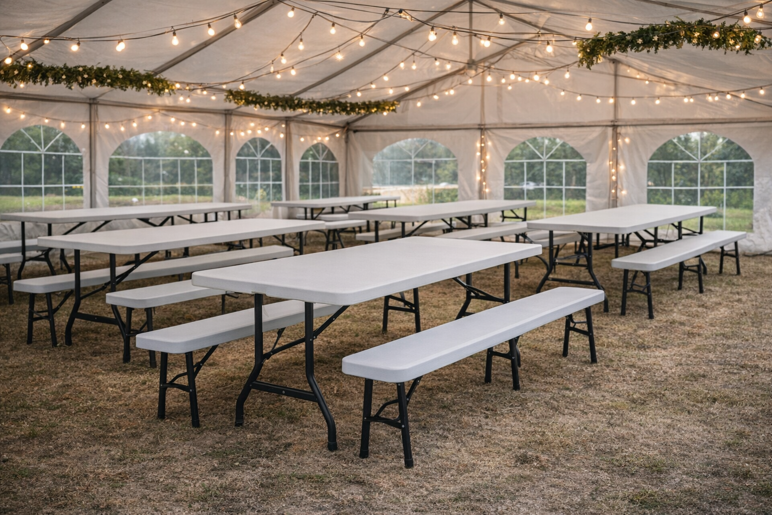Sammenleggbart bord og benker. God plass til 6 pr. bord (3 på hver side). Anbefales duker ved penere tilstellinger da dette er utleiebord og dermed har transportmerker.